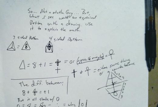 By the way, every pattern is 12 +1. The 12 makes up the structure, and the +1 ie 13 is the power source, ie Hz tone needed to match to create a zero point in that space-time matrices. It is how my composer friend Dan Allen and I wrote the new Quantum Music Theory. In Octaves he explains, you have a 12 +1. That is how wee need to expand the octaves from 6 to 12. and the +1 is what Hz frequency to match, to achieve different zero points. Math builds the structure of the cosmos, but music..animates it. One one side think Goddess is light and music, and the other side is the Sun, Male harmonic, which creates the structure. Without both, there is no space-time continuum. Without our consciousness, there is no zero point to quantify it. To fix the female harmonic that the Earth currently needs, we needed a zero point on a 432Hz frequency. The pattern is a 3 sided equilateral triangle, and the 4 sided pyramid has one extra side of 3, plus the addition of a 4 sided base, vs a 3. Not a math guy either . Would look something like (3x3x3x3) +1 alpha omega (3x3x3x3+4) So the +1 alpha omega is the center 6 leg cross in the flower of life. So a 0 becomes an omega with an inverse repeating palindromic sequence. That looks like an 8. That is a 3 sided pyramid alone. Two 3 sided pyramids counter rotating make the Alpha Omega, ie two omegas inside each other like an iron cross. A 4 sided pyramid alone is an alpha omega like a christian cross shape as you have the additional dimension opened. A three and 4 sided pyramid inverse and overlayed, create a +1 alpha omega as you are combining the omega and alpha omega.